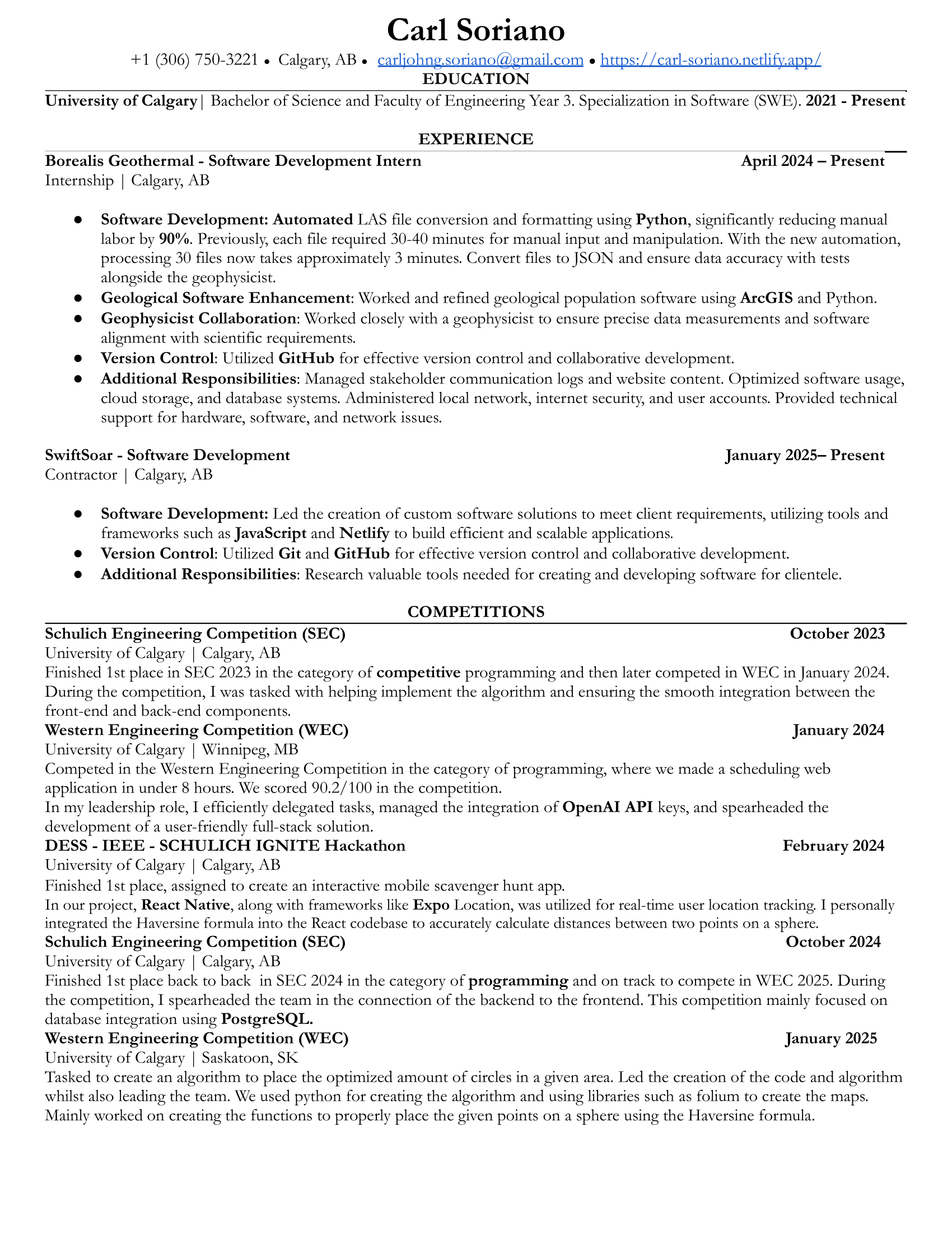 As a software engineering student at the University of Calgary, I have gained a strong foundation in the principles and practices of software development. I am dedicated to staying current with the latest technologies and trends in the field, and I am always eager to learn more about new tools and techniques. My strong work ethic and attention to detail have enabled me to consistently deliver high-quality work, and I am able to balance multiple projects and priorities effectively.