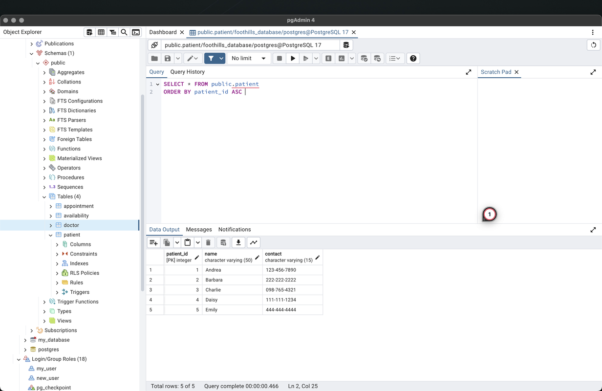 My main contribution was connecting the API endpoints to the PostgreSQL database. I ensured that data retrieval and updates were accurate and efficient, enabling seamless communication between the frontend and backend systems. This allowed the scheduling system to provide real-time information and updates for both hospital staff and patients, ensuring that schedules were always up-to-date and conflicts were minimized.
